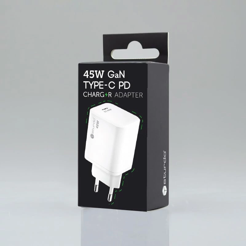 Sturdo hálózati töltő, mini GaN 45W, Type-C PD, 3A, fehér színű.